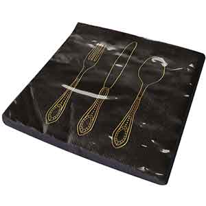 Papier Servietten, schwarz, BesteckSchwarze Papier-Servietten mit einem eleganten Motiv aus goldenem Besteck setzen stilvolle Akzente auf jedem gedeckten Tisch. Das kontrastreiche Design wirkt modern und zugleich festlich und passt sowohl zu besonderen Anlässen als auch zu einem liebevoll arrangierten Dinner zu Hause. Die dreilagige Qualität sorgt für eine angenehme Haptik und zuverlässige Stabilität während des Gebrauchs. Ob bei Geburtstagen, festlichen Feiern oder einem gemütlichen Abendessen – diese Servietten verleihen der Tischdekoration im Handumdrehen eine edle Note, ohne dass viel zusätzlicher Aufwand nötig ist. Inhalt: 20 dreilagige Servietten Gefaltete Größe: 16,5 x 16,5 cm Ausgefaltete Größe: 33 x 33 cm
