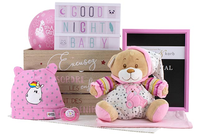 Die hinreißende Holzkiste ist eine Zierde für jedes Mädchenzimmer. Befüllt mit einem Lichtkasten (für Schlummerlicht), einem Spielbär, einem zartrosa Langarmshirt, einem Schnuller der im Dunkeln leuchtet, einer niedlichen Einhornmütze und einem Ballon.